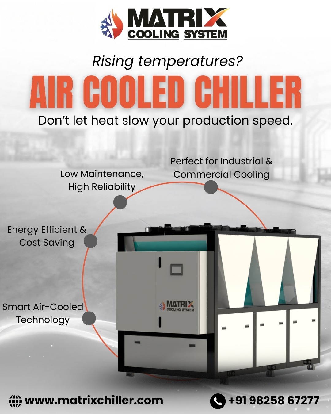 Matrix Cooling System is a leading air-cooled chiller manufacturer in Ahmedabad, delivering high-performance cooling systems for industrial and commercial applications. Recognized as a trusted Air Cooled Chiller Supplier in India and a reliable Air Cooled Chiller Dealer in Gujarat, the company offers energy-efficient, durable chillers built for demanding environments.