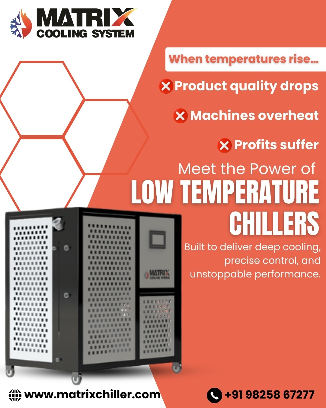 For industries requiring precise cooling, Matrix Cooling System offers high-performance Low Temperature Chillers engineered for reliability and efficiency. With decades of expertise, Matrix delivers precision cooling solutions across pharmaceuticals, food processing, chemical industries, labs, and aerospace testing.