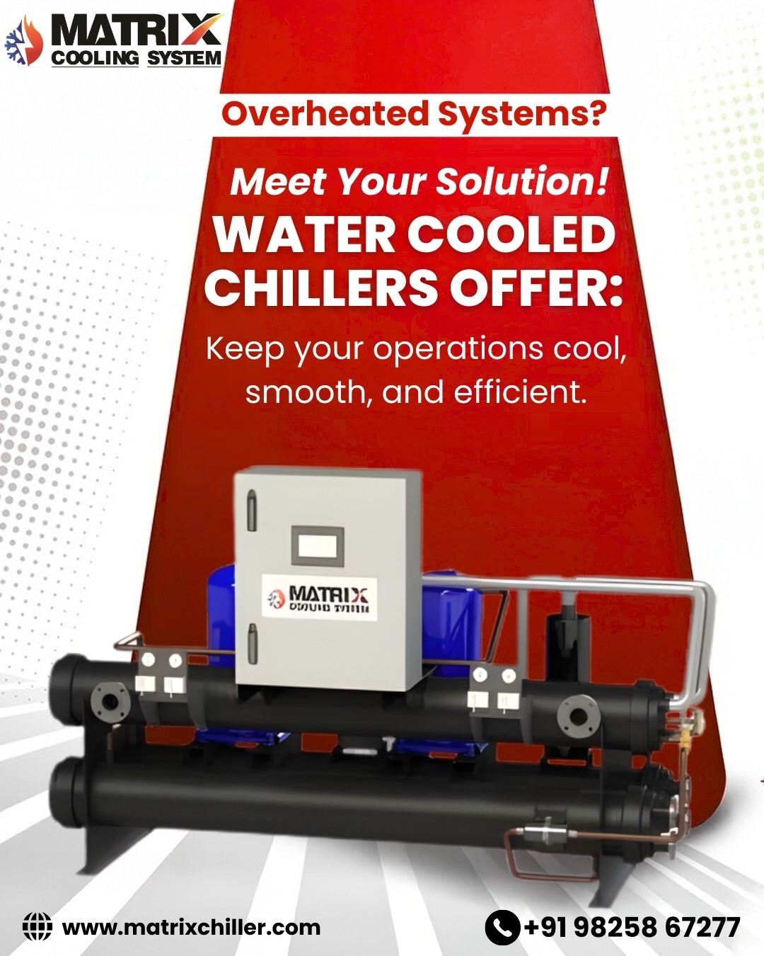 Matrix Cooling System is a trusted water-cooled chiller manufacturer in Ahmedabad, offering advanced cooling solutions for large commercial and industrial applications. A water-cooled chiller is a high-efficiency refrigeration system that removes heat from water or a water-glycol mixture using a vapor-compression cycle. Unlike air-cooled units, it uses a cooling tower and secondary water loop to dissipate heat, ensuring better energy efficiency and stable cooling performance.