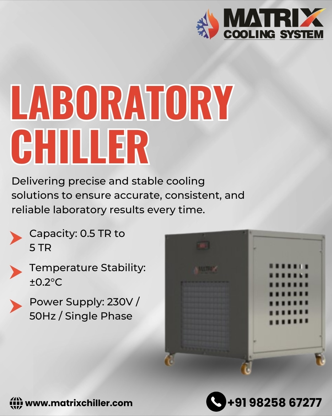 Whether in biotech, pharma, or analytical labs, Matrix Cooling System’s Laboratory Chiller guarantees accuracy, dependability, and efficiency every time.